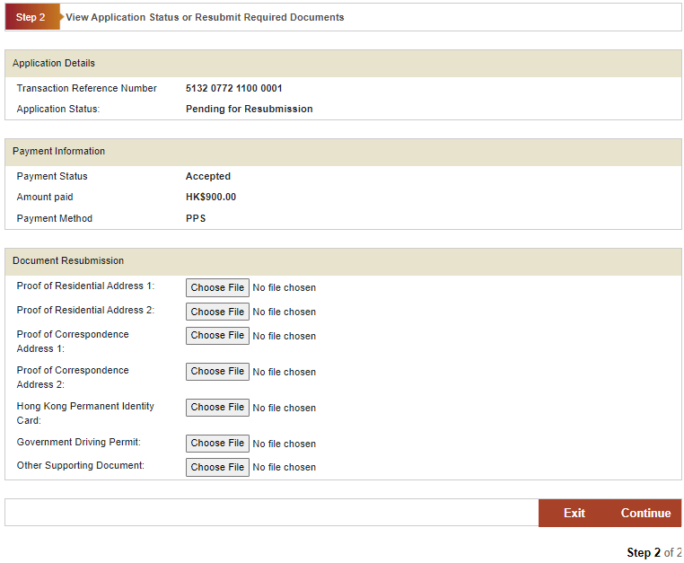 If any documents are required to be re-submitted, the system will allow the user to do so. Click the "Choose File" button to locate the files needed.