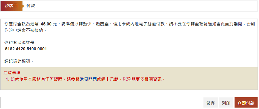 」以轉數快、繳費靈、信用卡或內地電子錢包繳交費用。付款完成後,系統會進入步驟五。